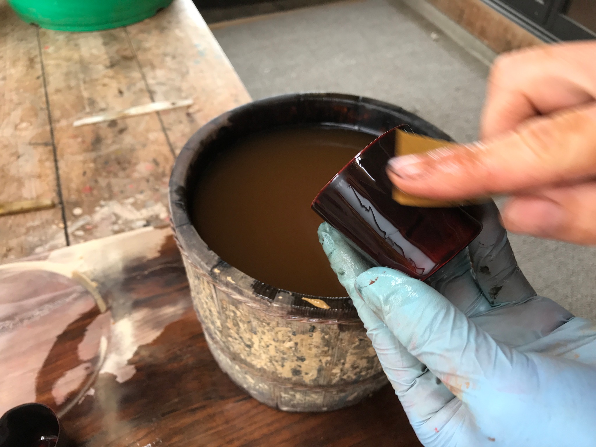 先日、朱漆の上に透け漆を塗り、