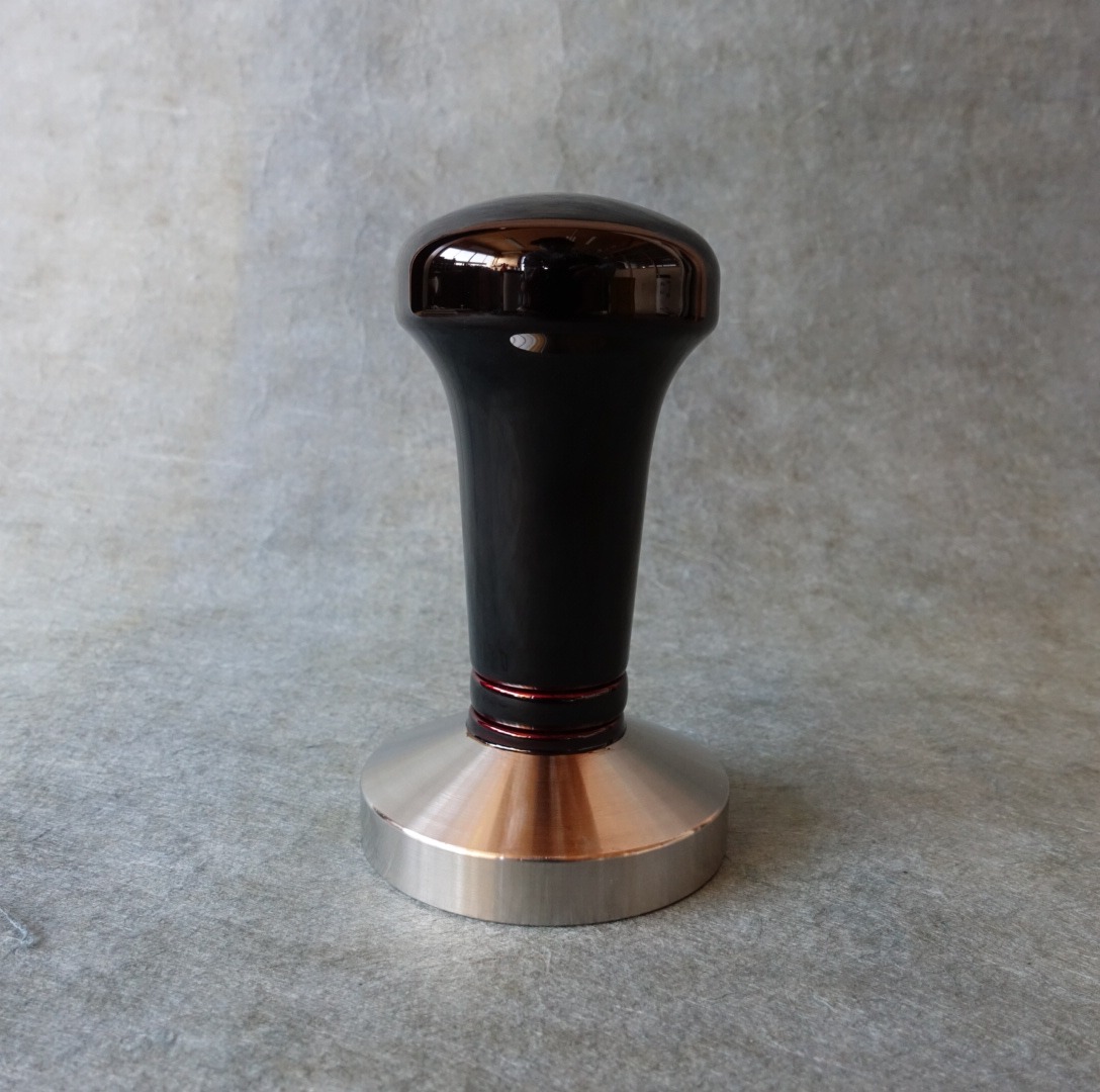 エスプレッソタンパー:地色のメタリックレッドの上に、茶褐色の透漆を塗り重ねました。透漆は徐々に透明度が増すので、色の変化が楽しみです