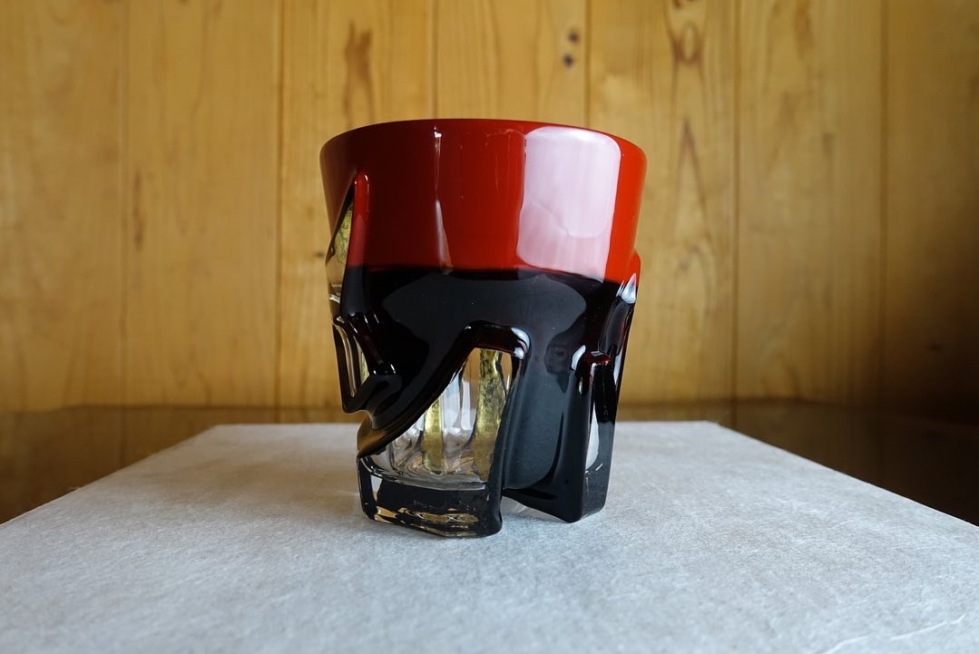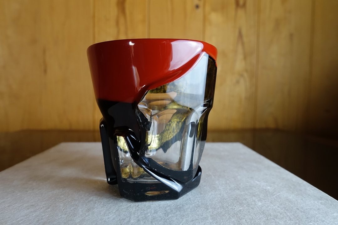 ガラスコップに漆を塗った器でも、漆以外の素材を芯材にした器でもなく、「漆そのもの」と「ガラス破片」でできた器。