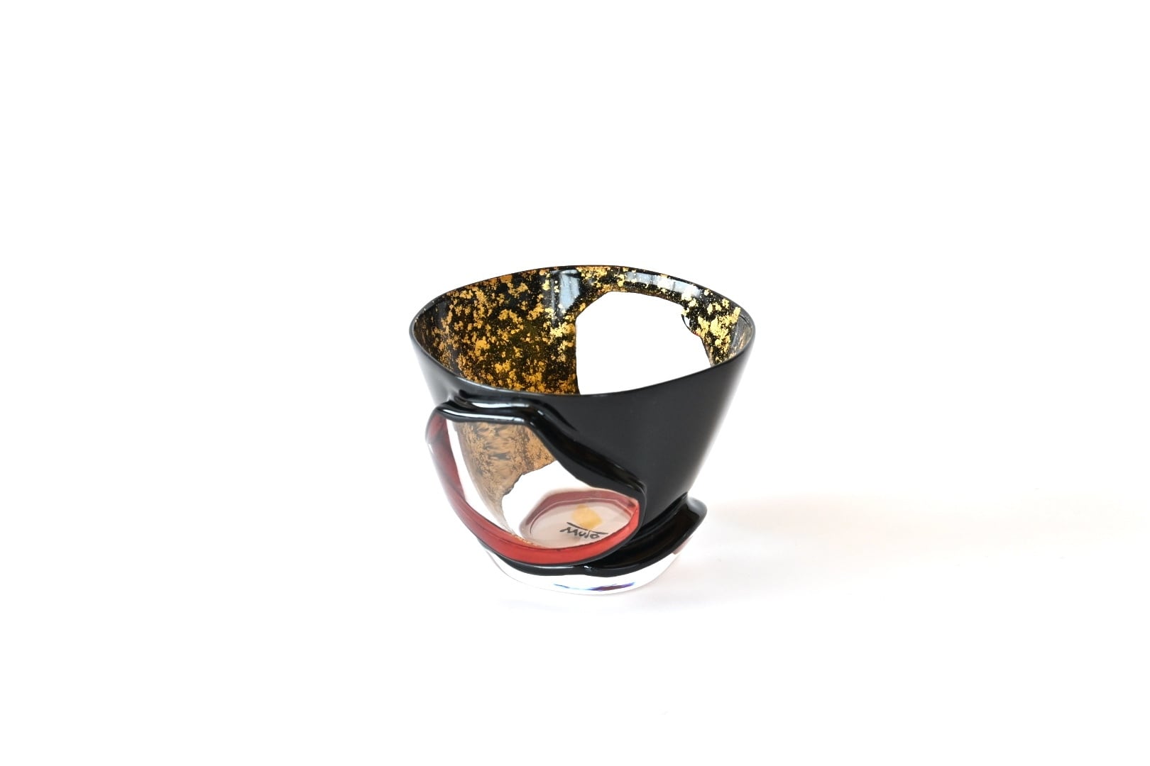 通常は、木やガラス、金属などの芯を必要とする漆器において、漆のみで成形し、漆の構造体でガラス破片を包み込む独自の特許技法により、薄さ1mmという極限の軽さと柔らかな口当たりを実現しました。