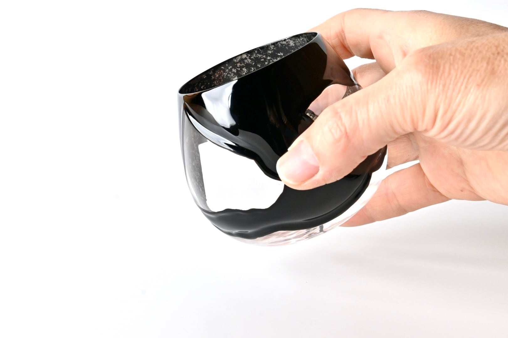 【漆とガラスの芸術酒器】薄さ1mm、漆のみでつくられた飲み口 《 包 -TsuTsuMu- 揺 [Yo](ゆらぎ) × 朔(さく) 》