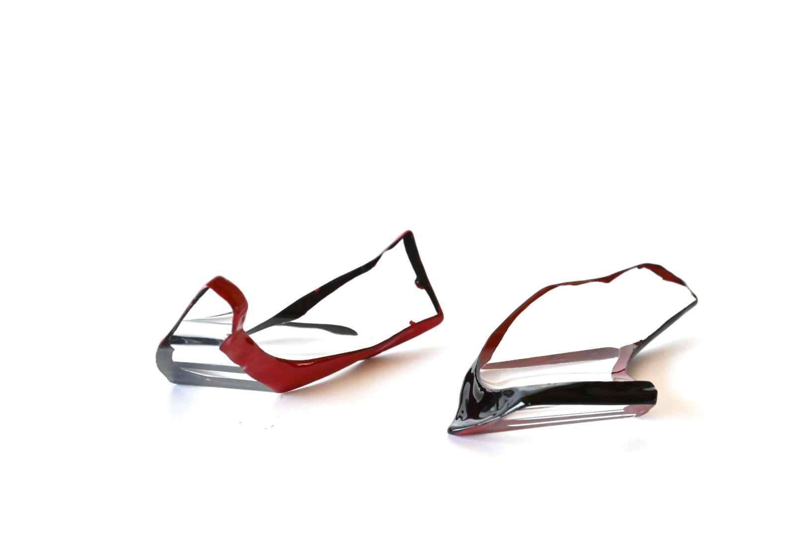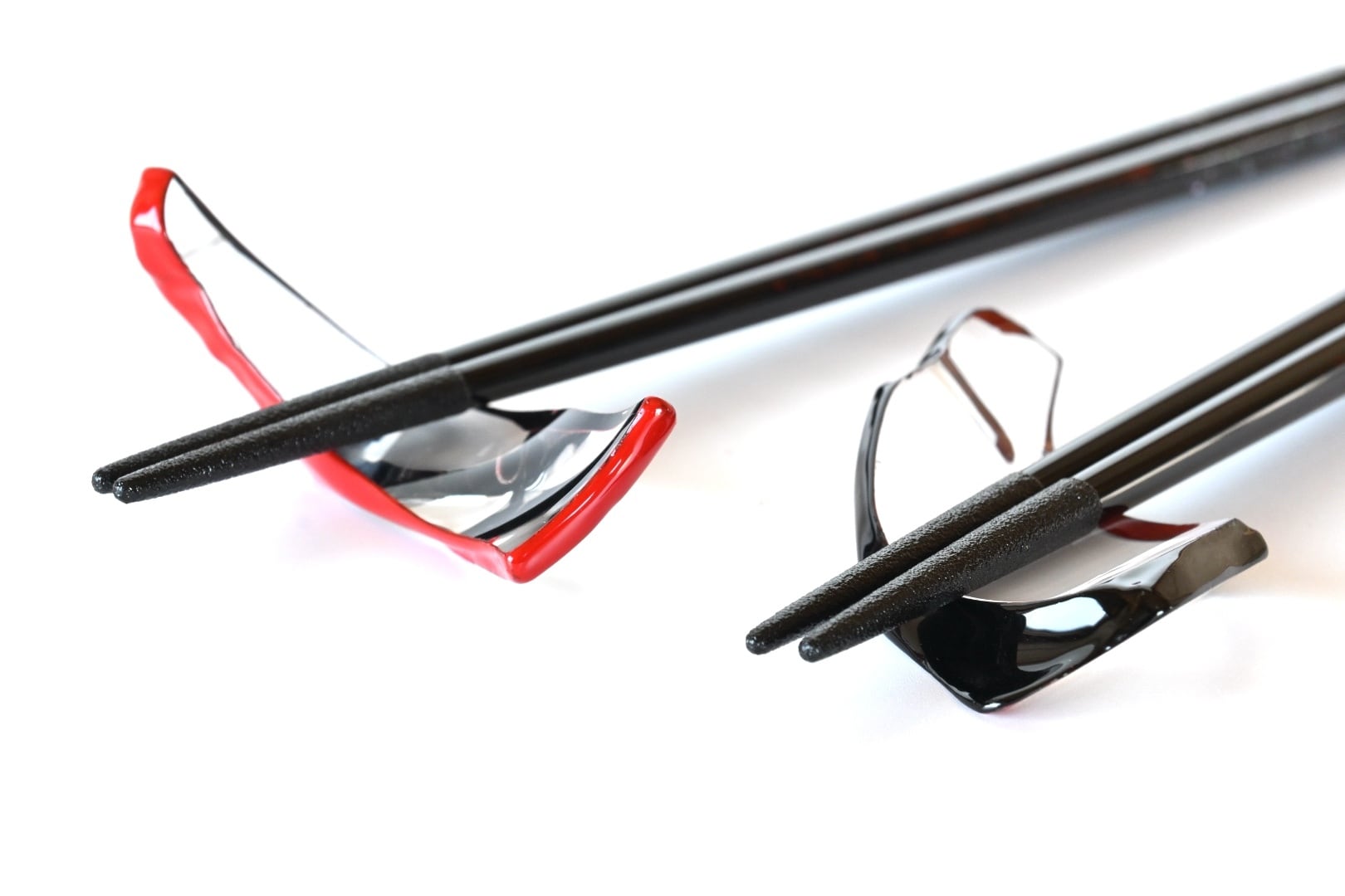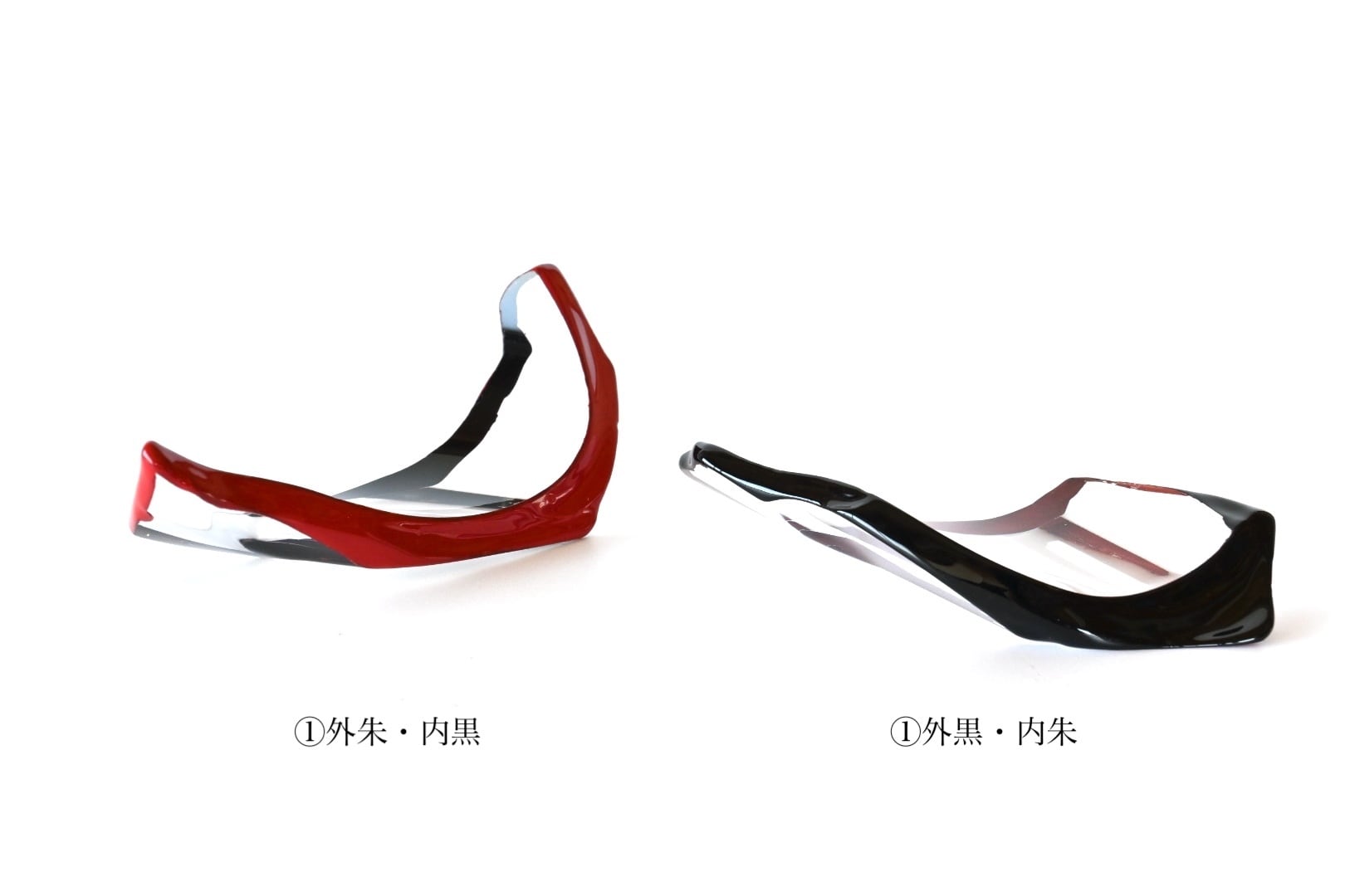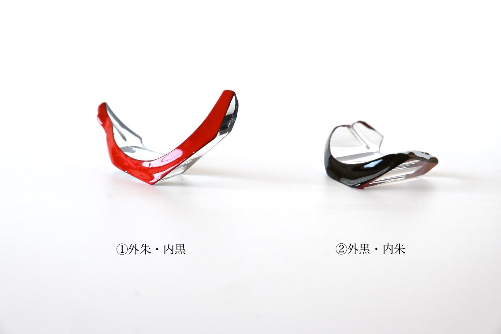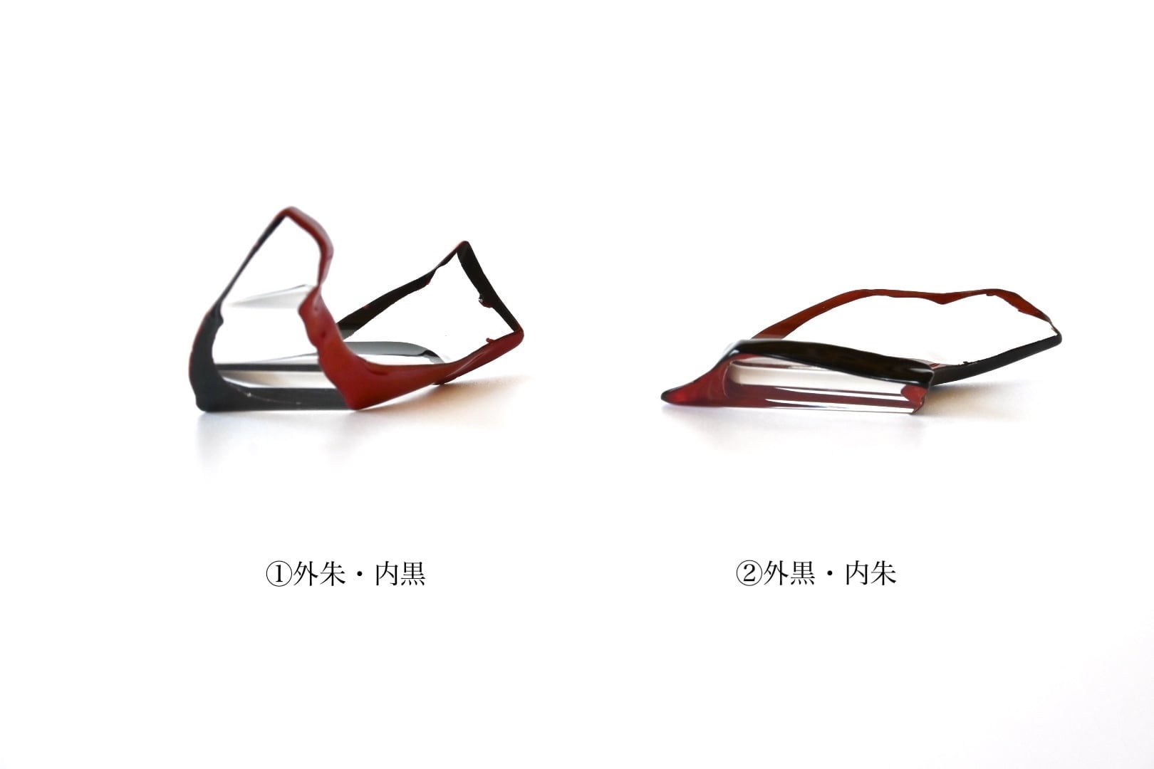 ガラス破片の断面に黒漆と朱漆を塗り重ねました。